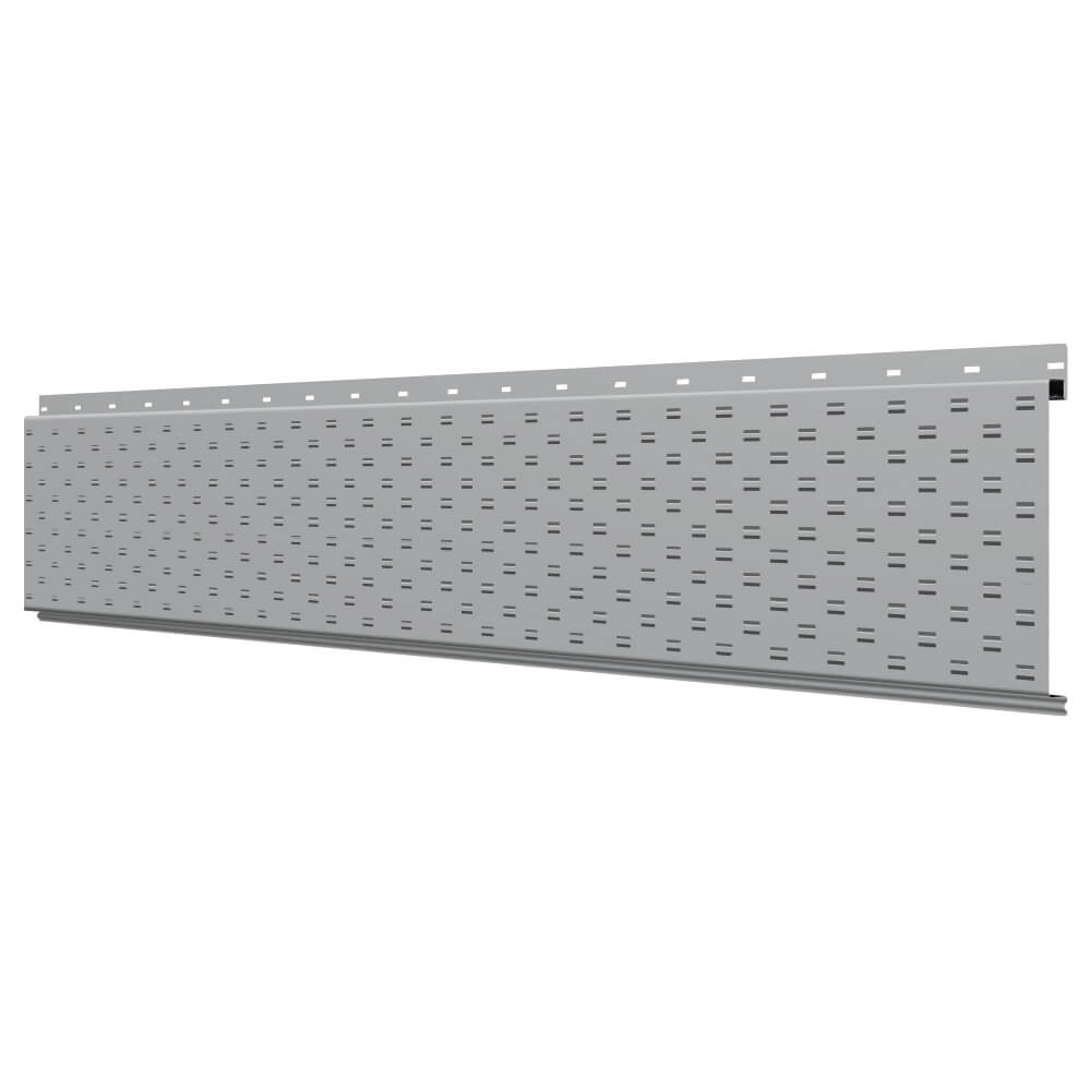 Линеарная потолочно-стеновая панель с ПЕРФОРАЦИЕЙ для вентиляции цвет RAL7004 Серый применяется в качестве софитов для подшивы крыши, наружной и внутренней отделки потолков, стен, фронтонов фасада дома в Чите.